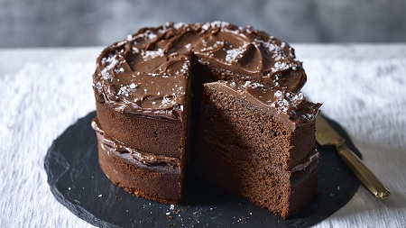 - ضعي إحدى الكيكات على حامل أو طبق كيك وقصي الجزء العلوي بحيث يصبح مسطحًا. وزعي الجزء العلوي من الكعكة بنصف كمية الجاناش. ضعي الكيك المتبقي على سطح الكيك وغطي وجهها بباقي الجاناش. نرش الملح فوق الكعكة.